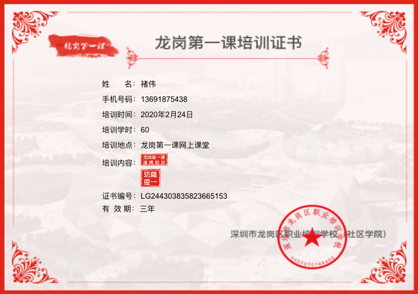 2019年2月24日,為減少接觸,公司組織全體員工在自己手機上關(guān)注“龍崗第一課學(xué)習(xí)平臺”,自行網(wǎng)上學(xué)習(xí)“龍崗第一課”通用知識篇和防疫篇一,并取得電子證書。