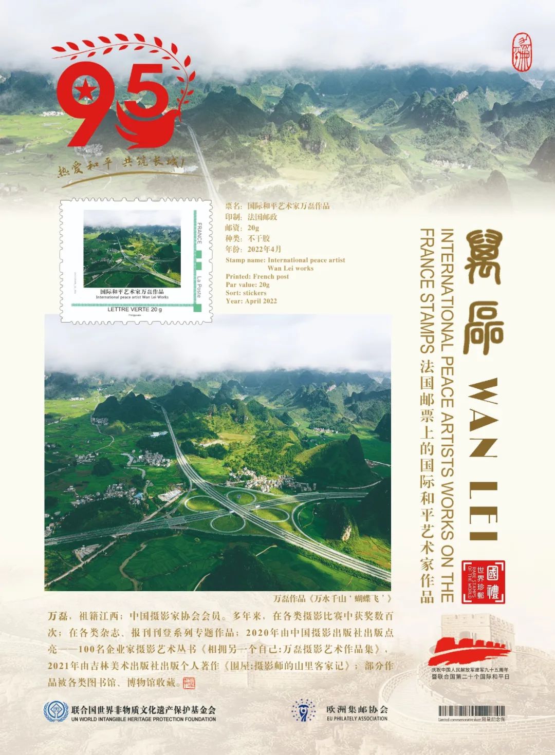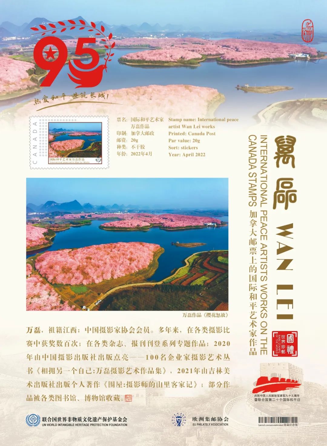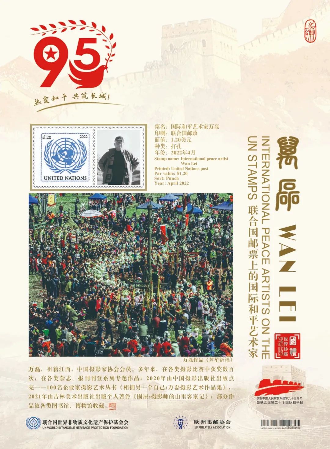 鑒于萬磊在中國攝影藝術(shù)上的杰出成就和為國際文化交流所做出的卓越貢獻(xiàn),業(yè)經(jīng)中國國際文化藝術(shù)發(fā)展交流中心、歐洲集郵協(xié)會、山水丹青國際藝術(shù)中心、藝術(shù)財經(jīng)雜志等國際權(quán)威機(jī)構(gòu)組織推薦,萬磊被聯(lián)合國世界非物質(zhì)文化遺產(chǎn)保護(hù)基金會授予“國際和平藝術(shù)家”榮譽(yù)稱號。這不僅是對中國藝術(shù)家杰出成就的肯定和贊譽(yù),也是對世界和平的深切呼喚!