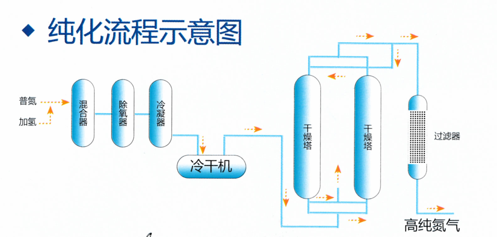 若用戶所需氮氣指標(biāo)大于99.99%時,在HTN制氮設(shè)備的基礎(chǔ)上應(yīng)配置純化設(shè)備。經(jīng)變壓吸附(PSA)系統(tǒng)制得的原料氮氣(≤2%的殘氧)與少量氫氣混合后,在填裝有催化劑的反應(yīng)器中殘氧與氫反應(yīng)生成水蒸氣,反應(yīng)方程式為2H2+O2→2H2O+熱,隨后經(jīng)過后冷卻器,使大部分水蒸氣冷凝下來,并經(jīng)過高效水分離器或冷干機除去大部分冷凝水,然后進入吸附式干燥器,使產(chǎn)品氣露點最低達到-70℃,產(chǎn)品氣純度通過分析儀連續(xù)進行在線監(jiān)測。