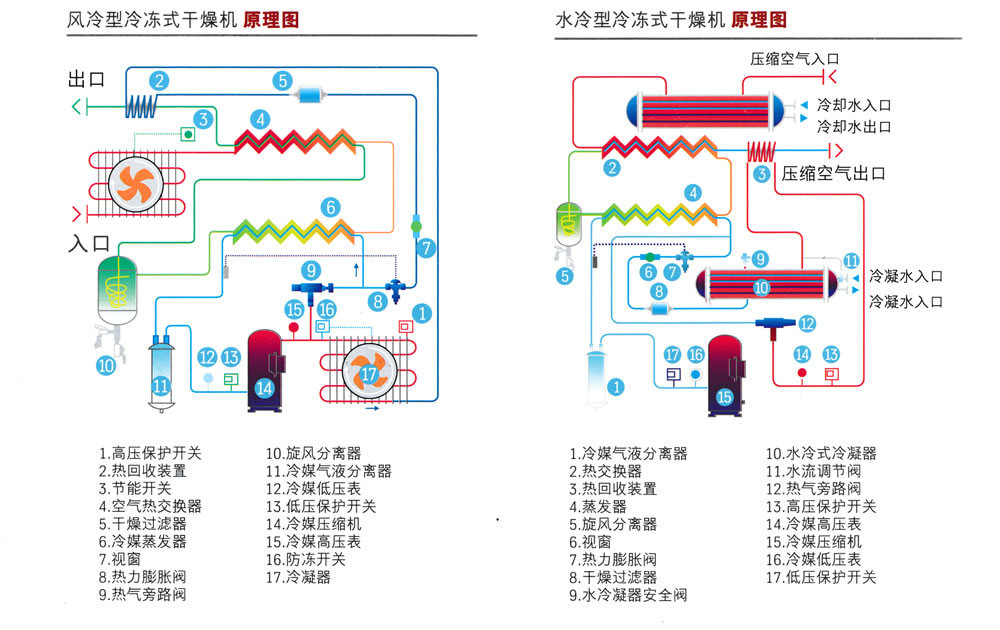 壓縮空氣是所有工業(yè)領(lǐng)域和技術(shù)生產(chǎn)過程中不可缺少的操作和加工動(dòng)力。為防止生產(chǎn)過程中出現(xiàn)停工,壓縮空氣必須清潔、干燥且不含油。壓縮空氣是通過將大量的環(huán)境空氣增壓得到的。通常情況下,此類空氣中含有一些有害物質(zhì),如臟的顆粒物質(zhì)和水蒸氣形式存在的濕氣。形成有害的腐蝕性乳濁液,導(dǎo)致設(shè)備停止運(yùn)行,造成不可避免的巨大損失。進(jìn)入干燥機(jī)的壓縮空氣通過外流的冷壓縮空氣在“空氣一空氣”換熱器中預(yù)冷。然后,經(jīng)過預(yù)冷的空氣流經(jīng)“制冷劑一空氣”換熱器,進(jìn)下一步冷卻至需要的露點(diǎn)溫度。壓縮空氣中的濕氣凝結(jié)成水滴,并被自動(dòng)收集和排放。處理后的千燥壓縮空氣與重新進(jìn)入的濕熱壓縮空氣在“空氣一空氣”的換熱器中二次交換升溫后進(jìn)入用氣管道。這樣既可以防止用氣管道結(jié)露,又節(jié)約了能源減輕機(jī)器的負(fù)荷。