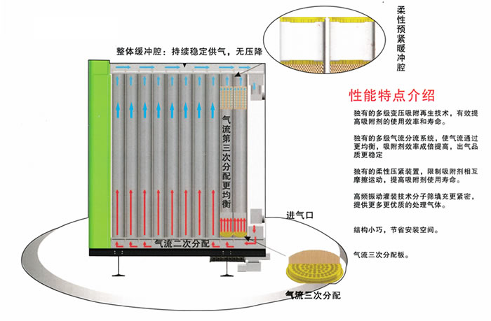 采用國際知名的優(yōu)質分子篩,吸附模組吸附劑的用量只有傳統(tǒng)式的一半以下,降低了使用費用 |